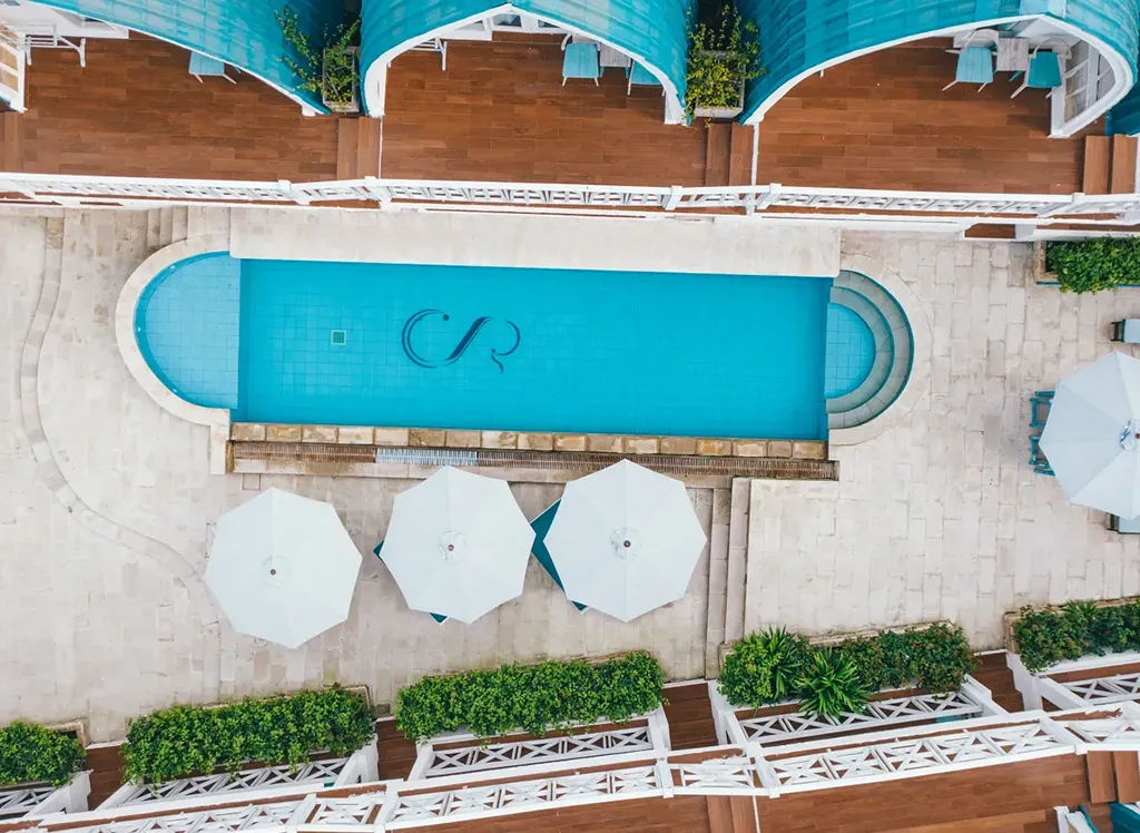 Poolen på hotellet giver mulighed for at blive kølet ned, og selve formen på poolen er lidt speciel. Den er nemlig formet som en omvendt pyramide, så der er lavest ved kanterne og dybest i midten.