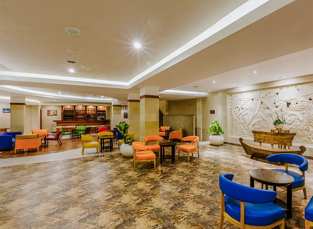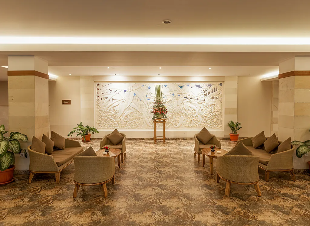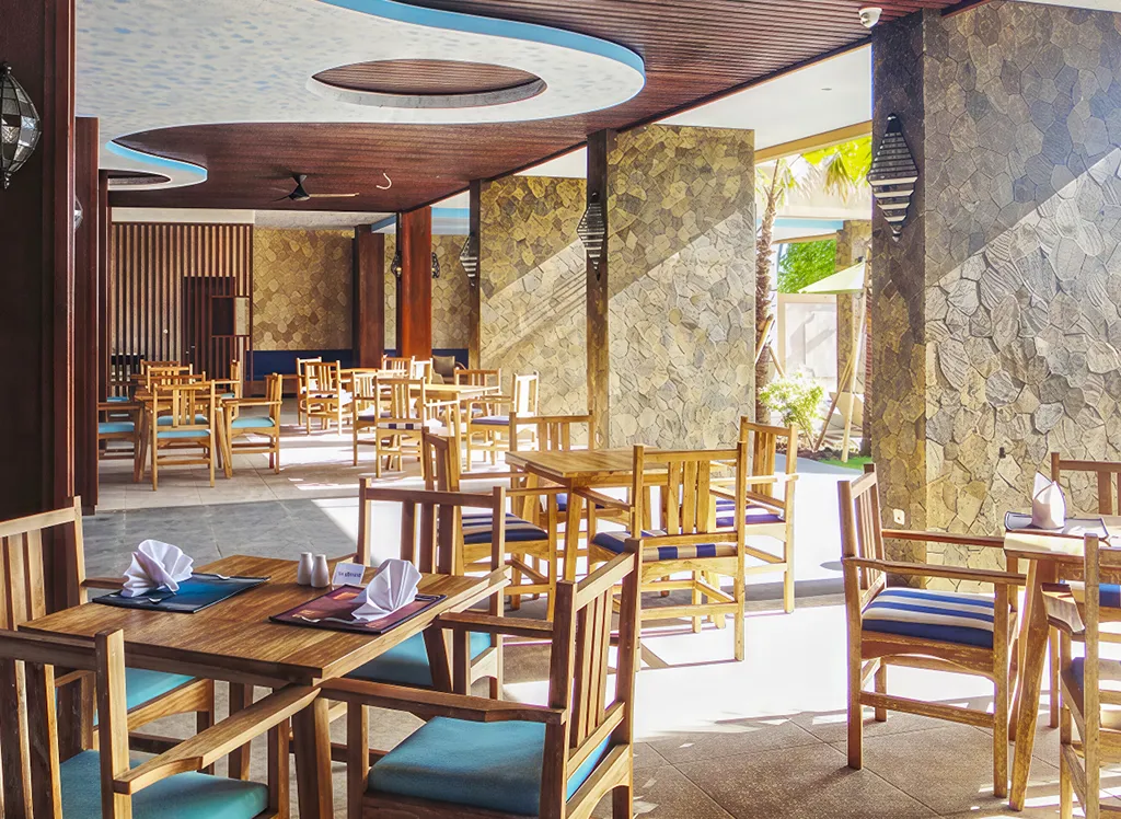 Resortets restaurant tilbyder et lækkert udvalg af både internationale retter og traditionelle balinesiske specialiteter, tilberedt med friske, lokale råvarer. Restauranten har i øvrigt en fantastisk beliggenhed ved stranden, hvilket giver dig mulighed for at nyde udsigten over havet mens du spiser din mad. Der serveres alt fra friske skaldyrsretter til lette snacks og cocktails, så du kan nyde både en afslappet frokost eller en romantisk middag i smukke omgivelser.