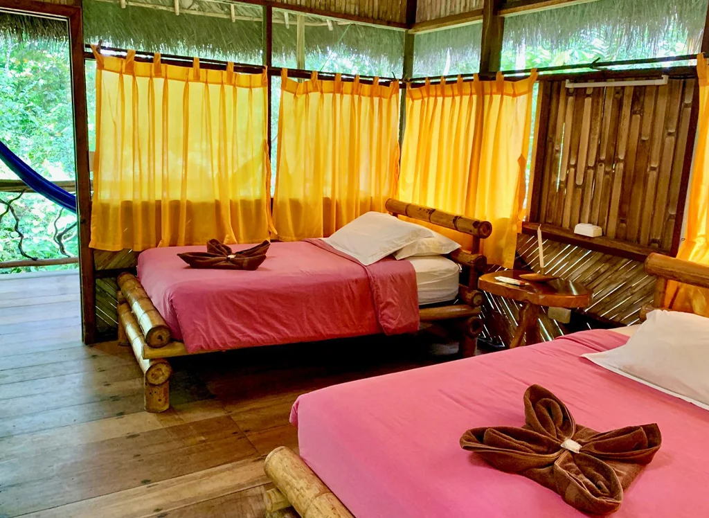 Du bor i rustikke og komfortable cabañas, som alle er bygget i naturlige materialer og harmonerer med omgivelserne. Værelserne har myggenet om sengene, balkon eller terrasse med udsigt til naturen. Derudover tilbydes der Wi-Fi i fællesområderne. Her får du enkel komfort og en tæt forbindelse til den omkringliggende regnskov.