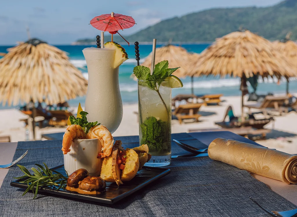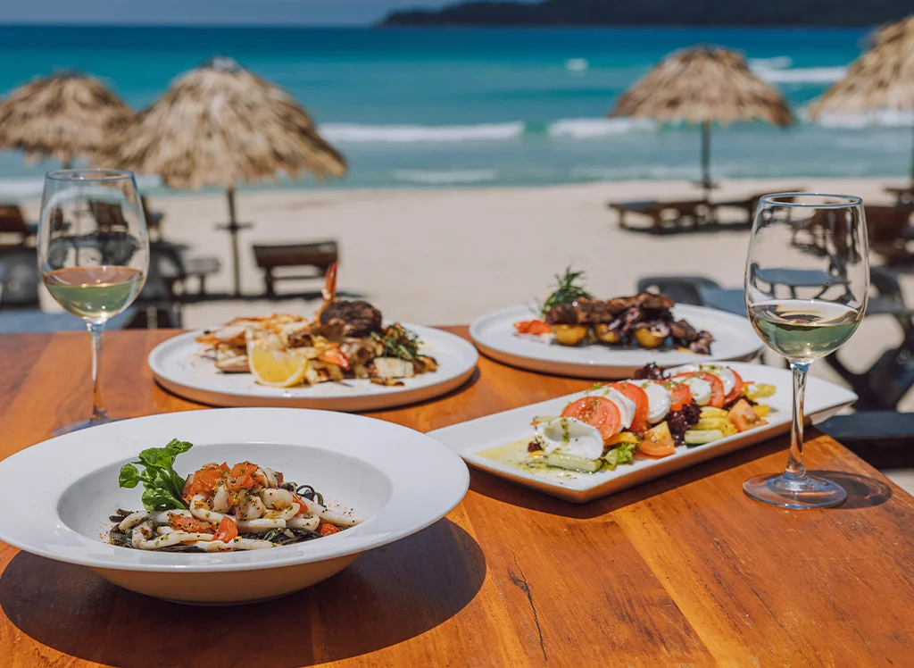 Resortet har to restauranter: The World Café og Santai Restaurant. Her serveres et lækkert udvalg af både internationale og lokale retter – fra friskfanget fisk og skaldyr til asiatiske klassikere og vestlige favoritter. Restauranterne ligger tæt ved stranden, så du kan nyde dine måltider med udsigt til havet og med lyden af bølger i baggrunden. Der er også en strandbar, hvor du kan nyde forfriskende cocktails og snacks i solnedgangen.