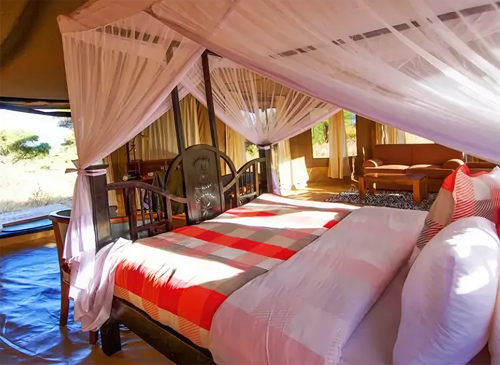 På lodgen bor du i luksustelt med fast bund, så du rigtig kan opleve den afrikanske natur og de mange lyde, der er. Hvert telt har eget bad/toilet og rindende vand, så selv om du bor i telt, er det ikke under primitive forhold.