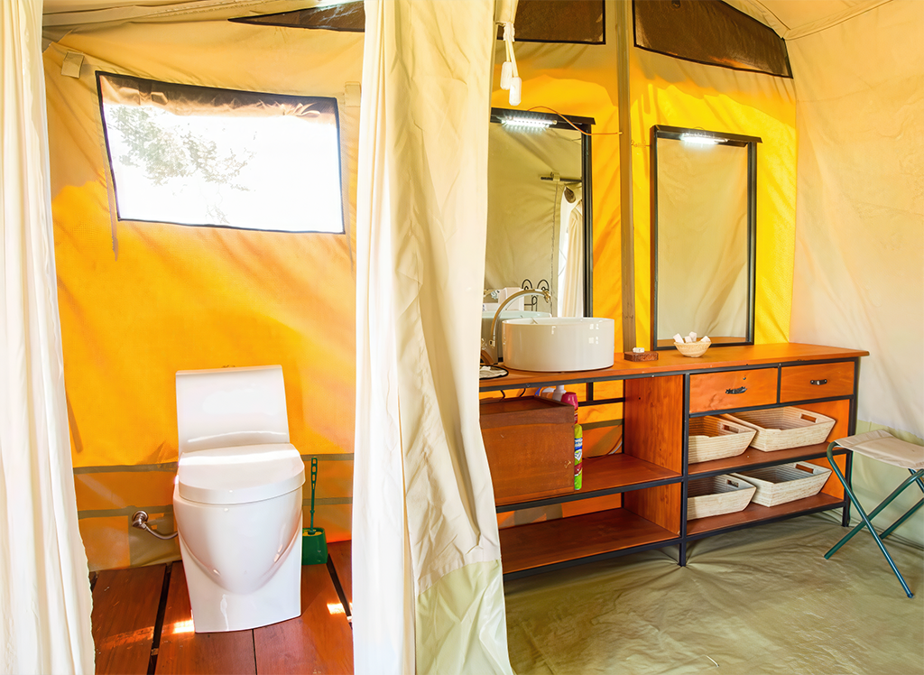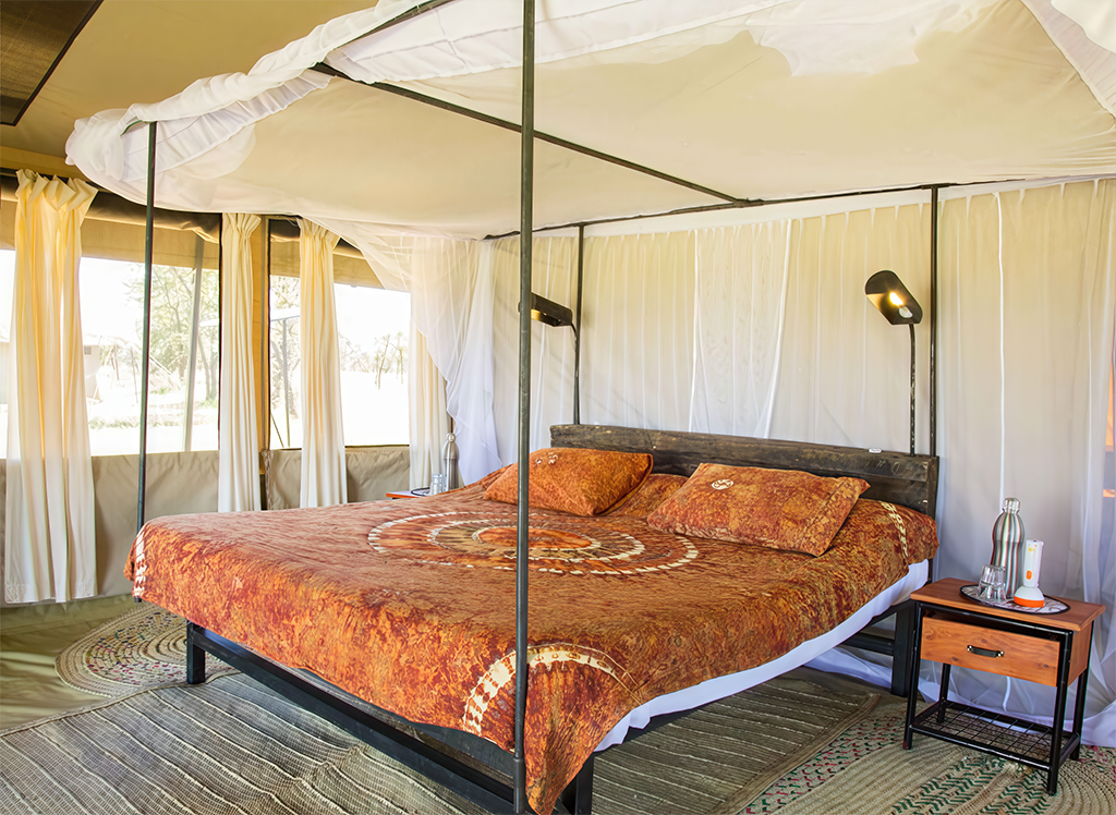 Der er 15 værelser på lodgen, og de ligger i separate luksustelte og har eget badeværelse med bruser. Der er elektricitet og rindende vand i teltene. Hvert værelse har dobbeltseng eller to enkeltsenge, myggenet, skrivebord og flasker med drikkevand.