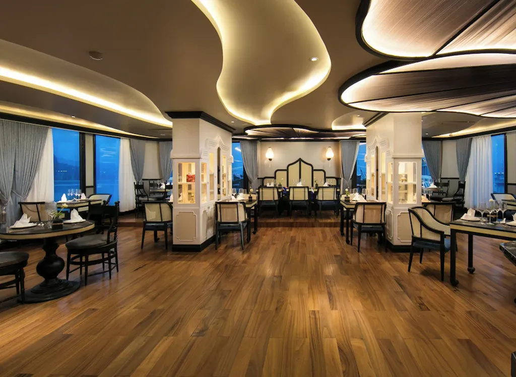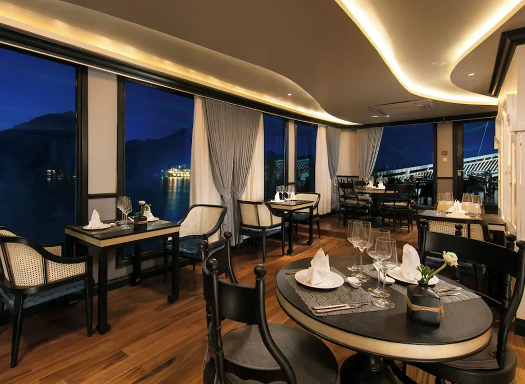 Cruisets restaurant tilbyder både lokale vietnamesiske specialiteter samt internationale retter. Derudover har du også rig mulighed for at nyde friskfanget fisk og skaldyr - hvis du er til det. Den elegante spisesal med panoramaudsigt over bugten skaber den perfekte atmosfære for en mindeværdig oplevelse.