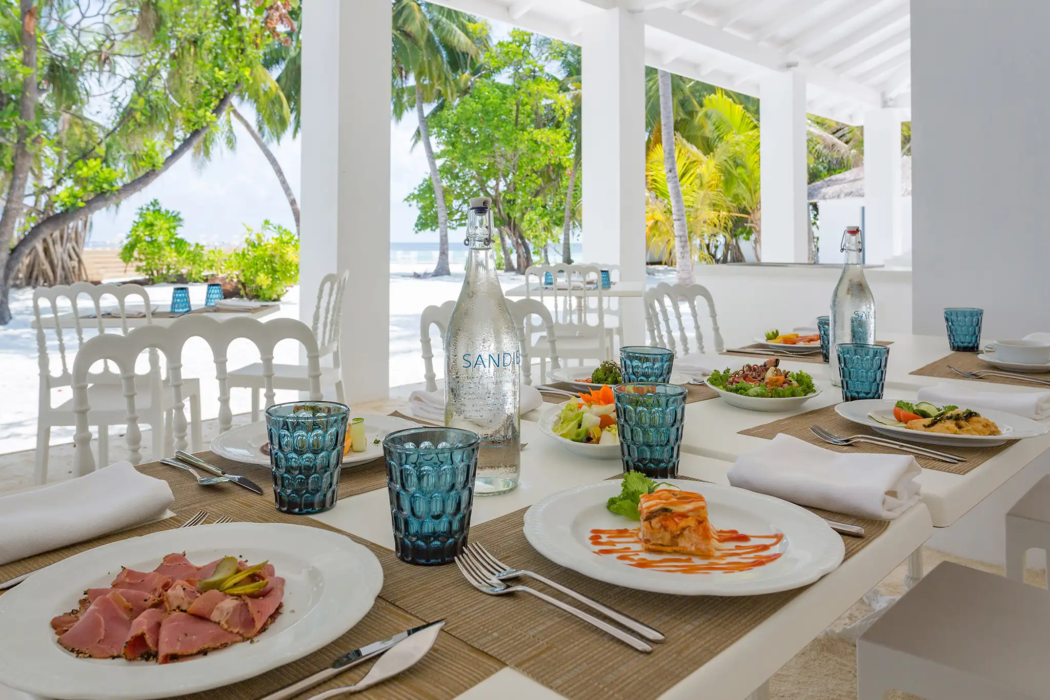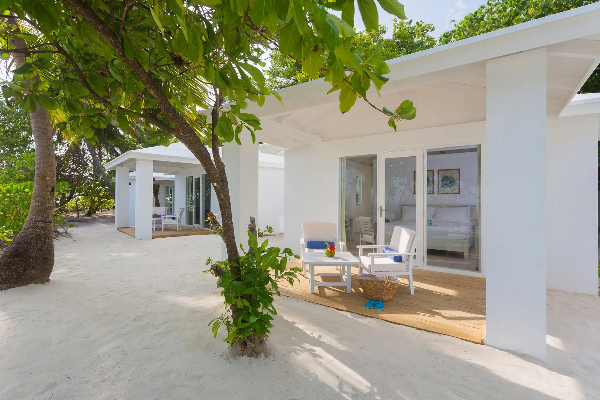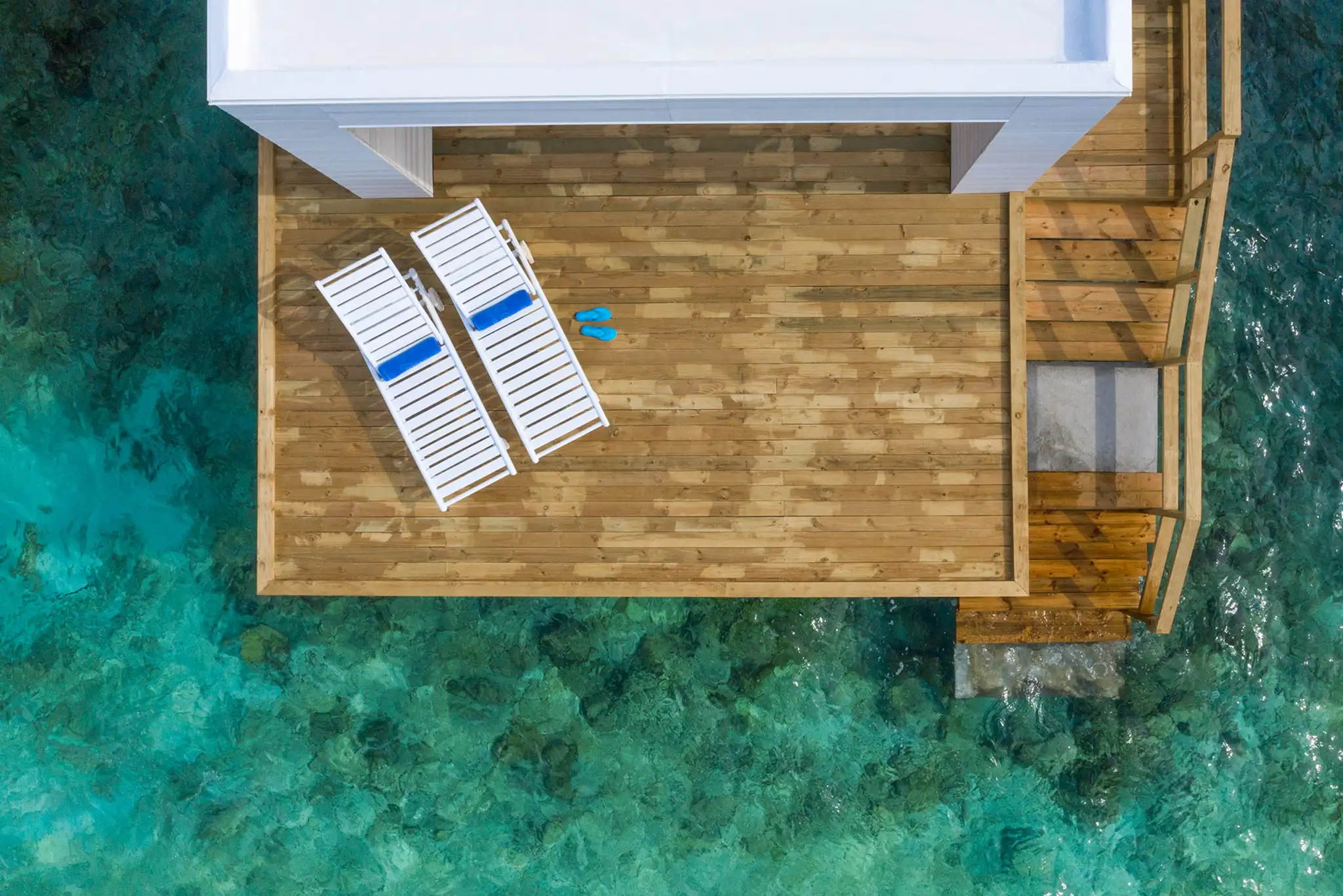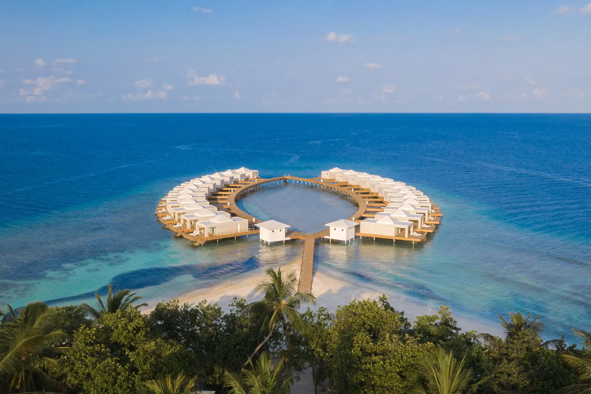 På Sandies Bathala bor du enten i en lækker Beach Bungalow direkte på stranden eller i en Water Villa, som står på pæle i den turkisblå lagune.