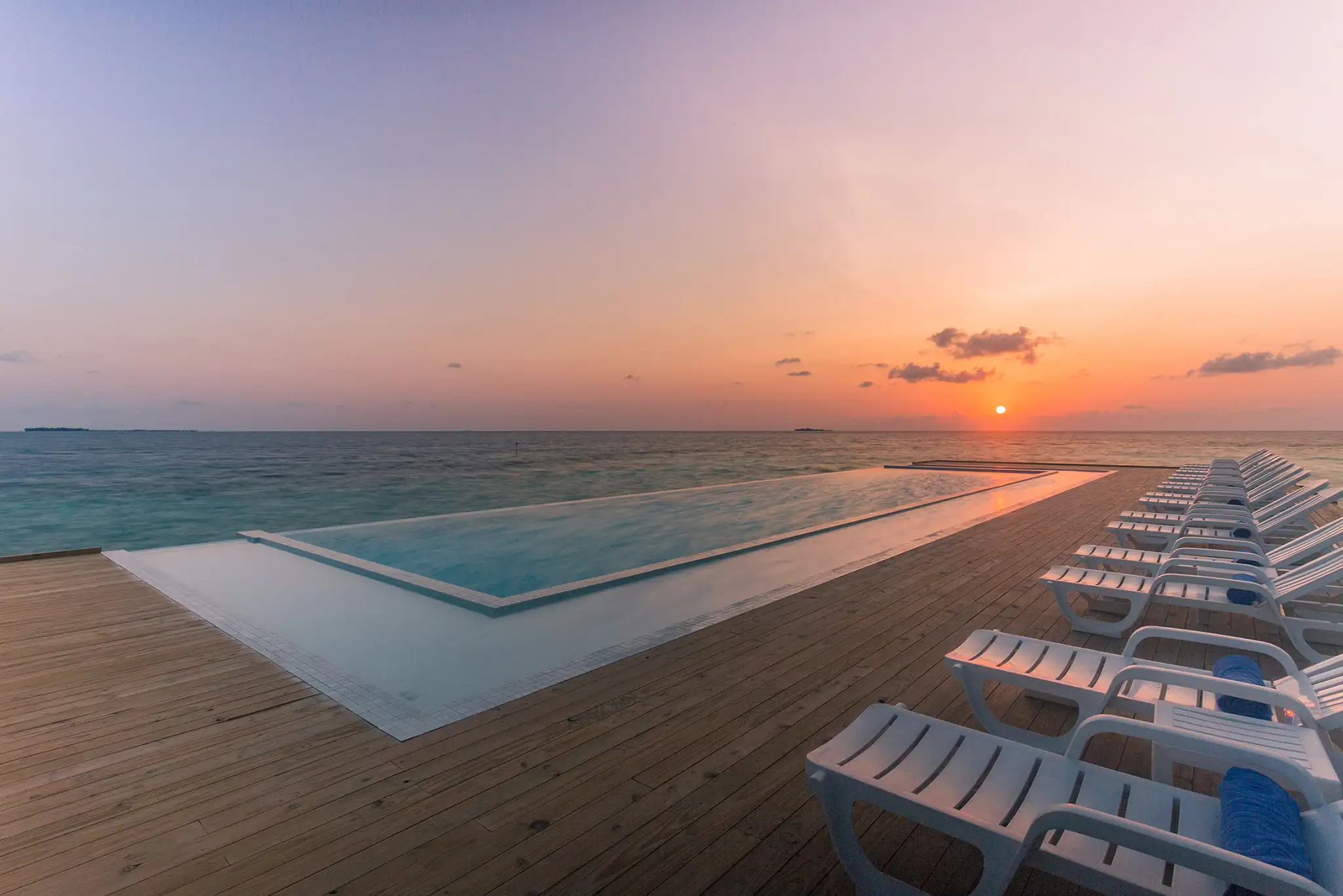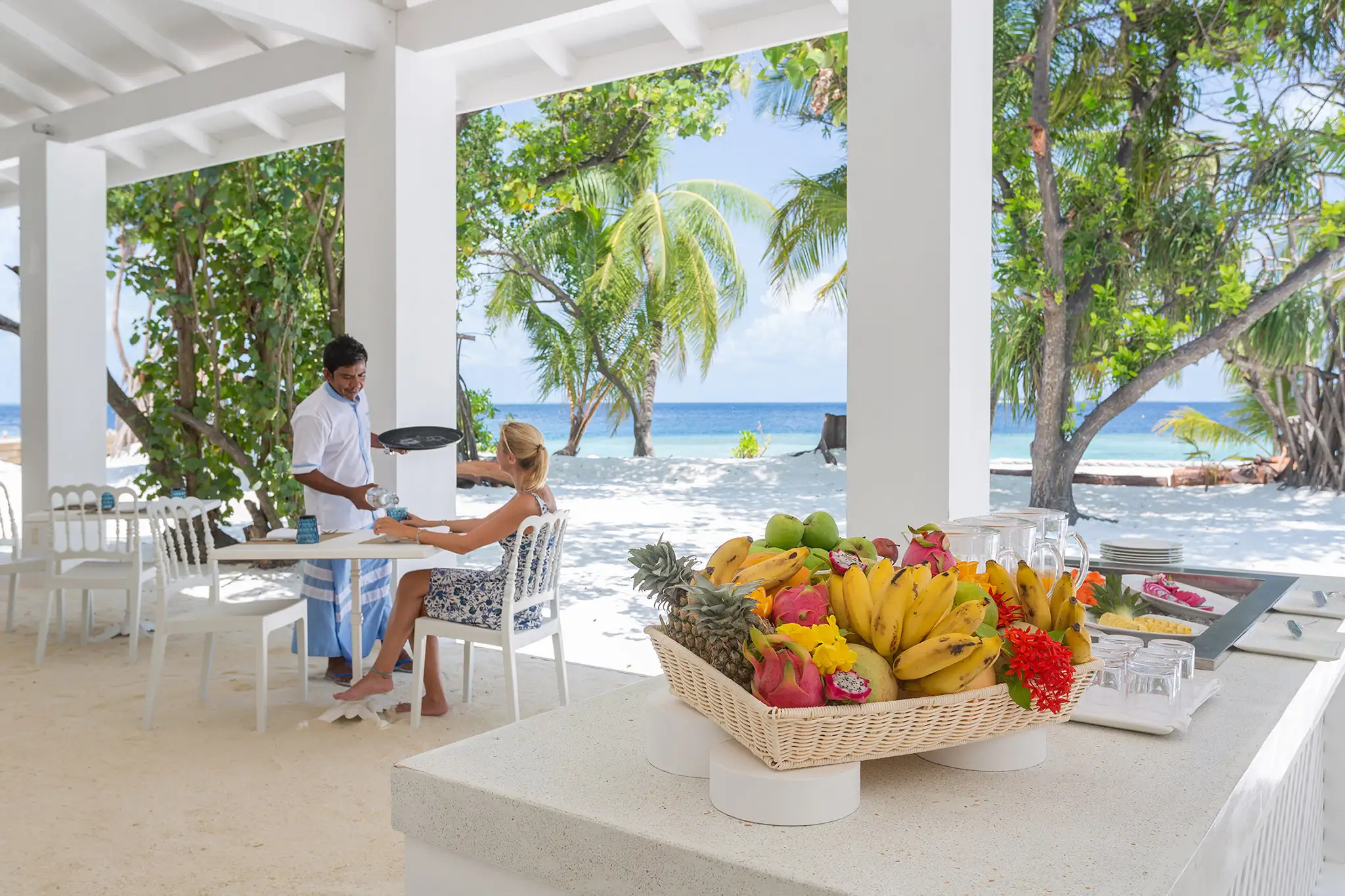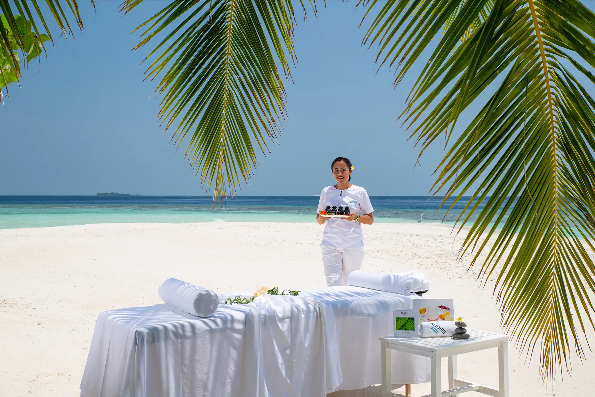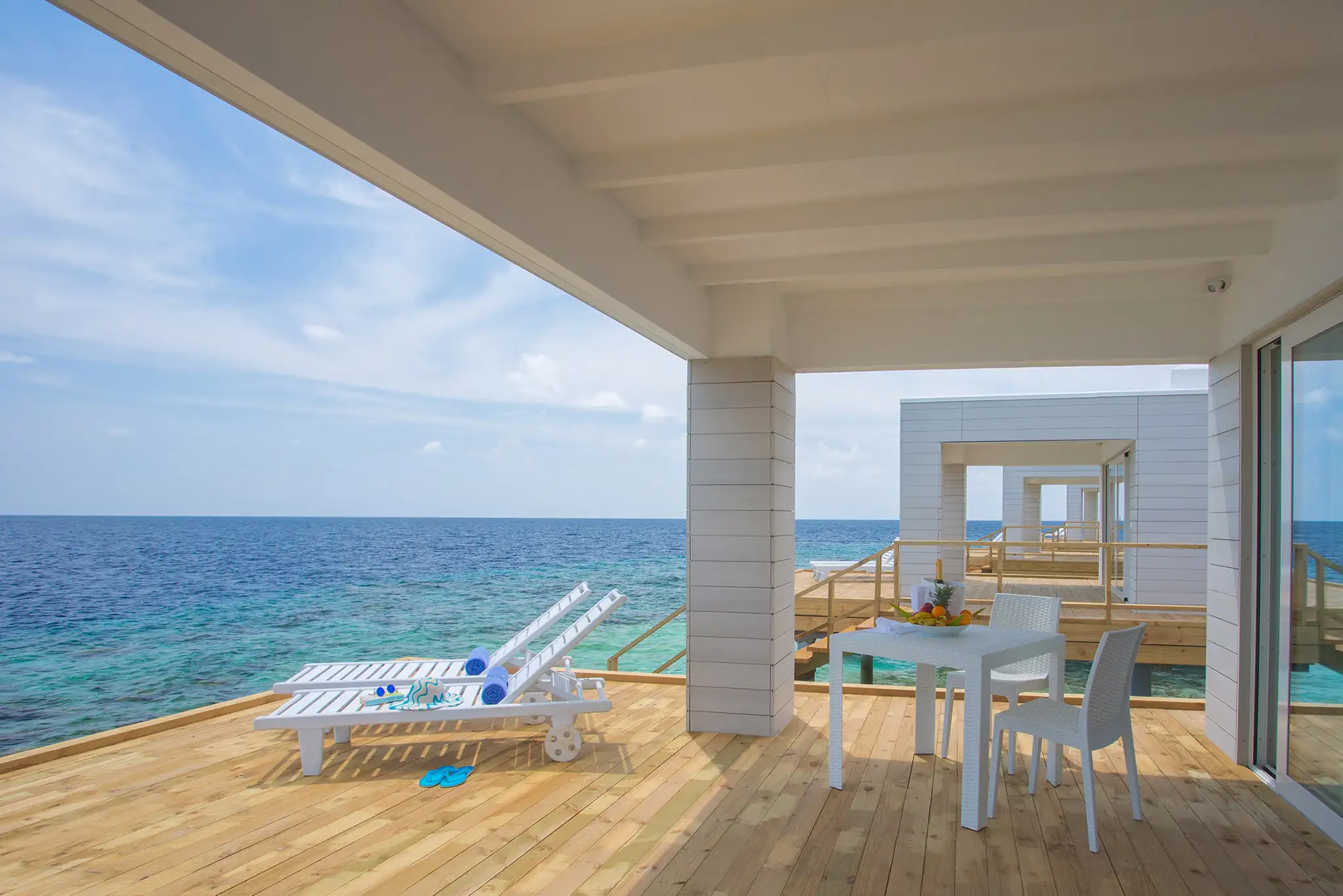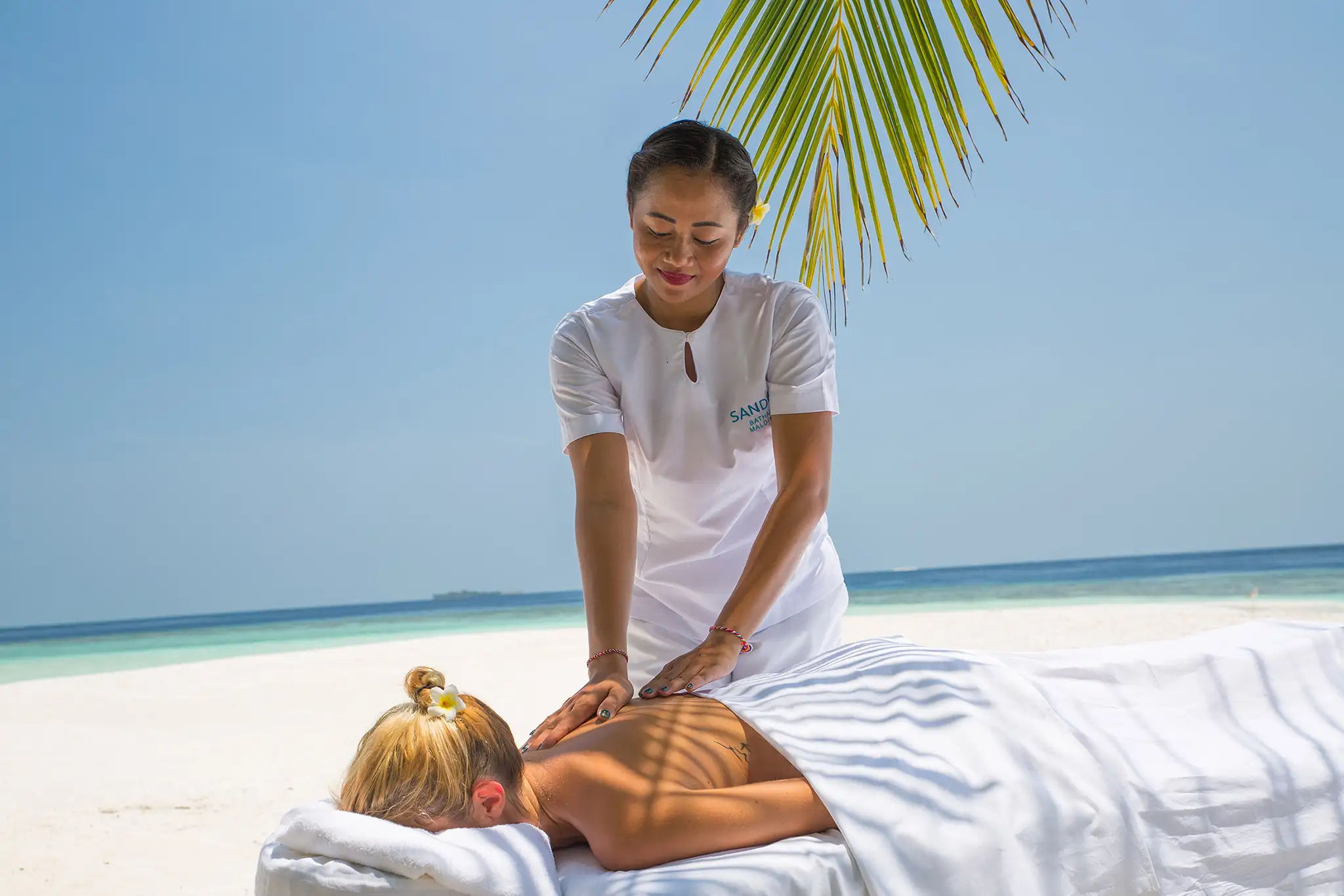 På Sandies Bathala bor du enten i en lækker Beach Bungalow direkte på stranden eller i en Water Villa, som står på pæle i den turkisblå lagune.