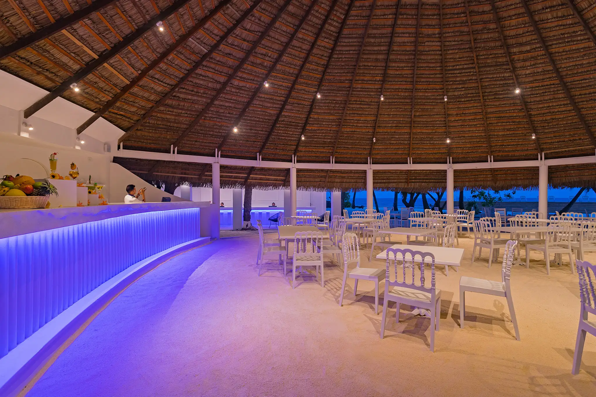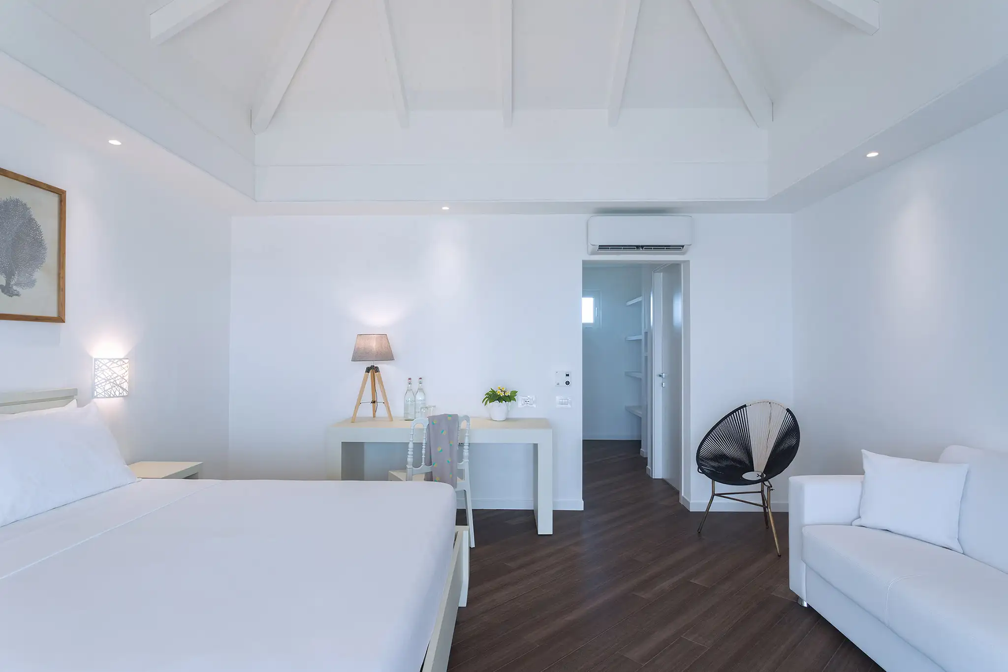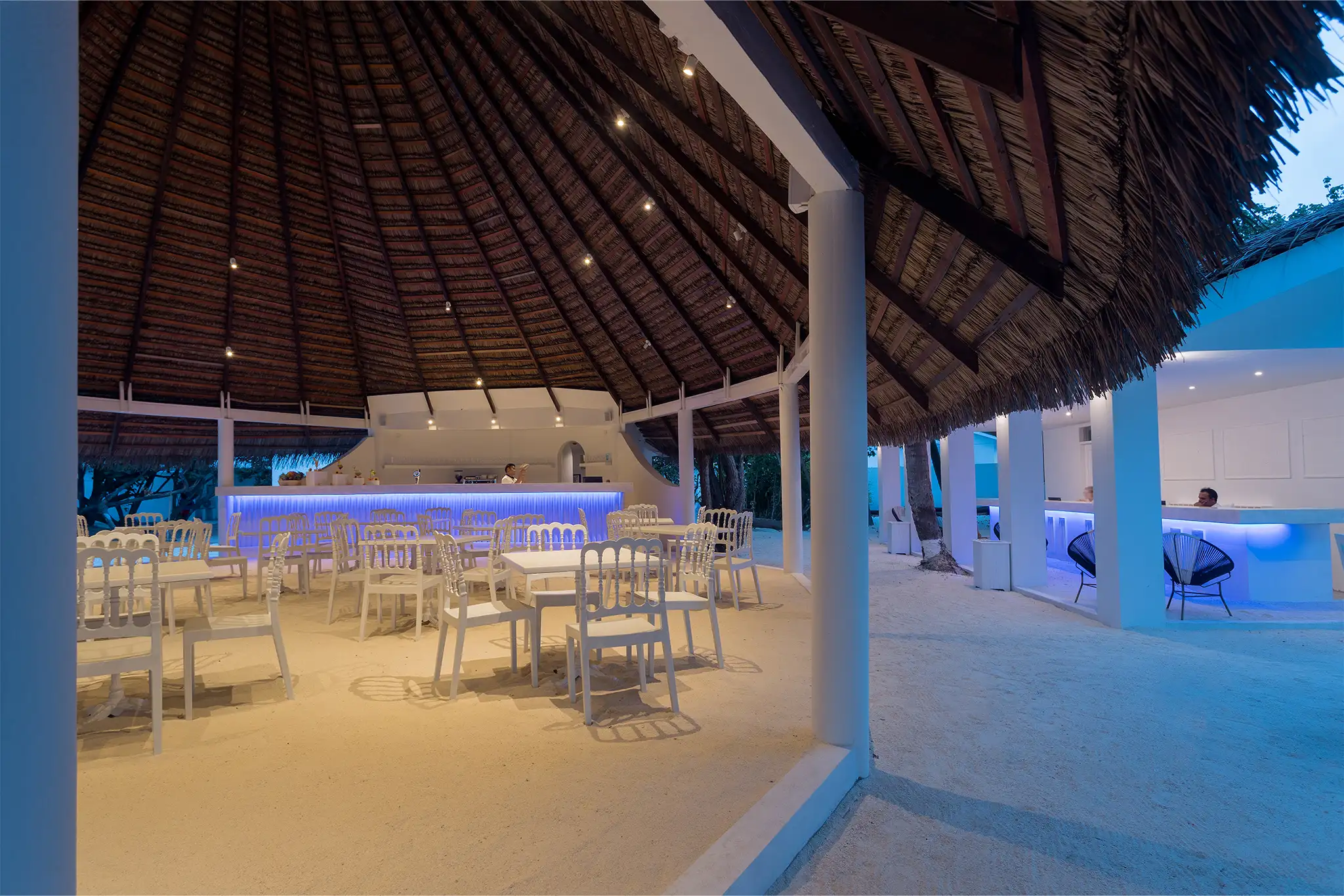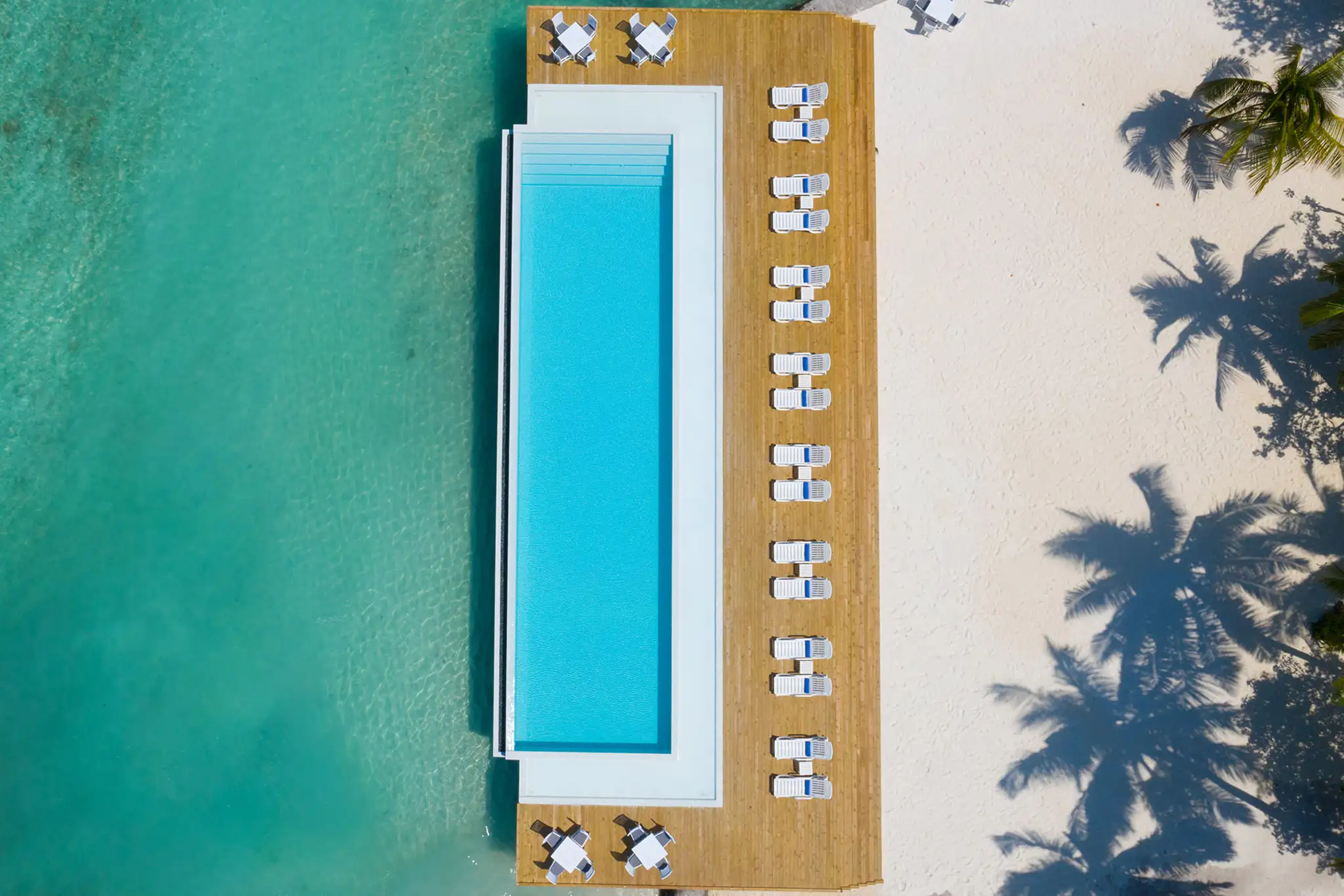 På Sandies Bathala bor du enten i en lækker Beach Bungalow direkte på stranden eller i en Water Villa, som står på pæle i den turkisblå lagune.
