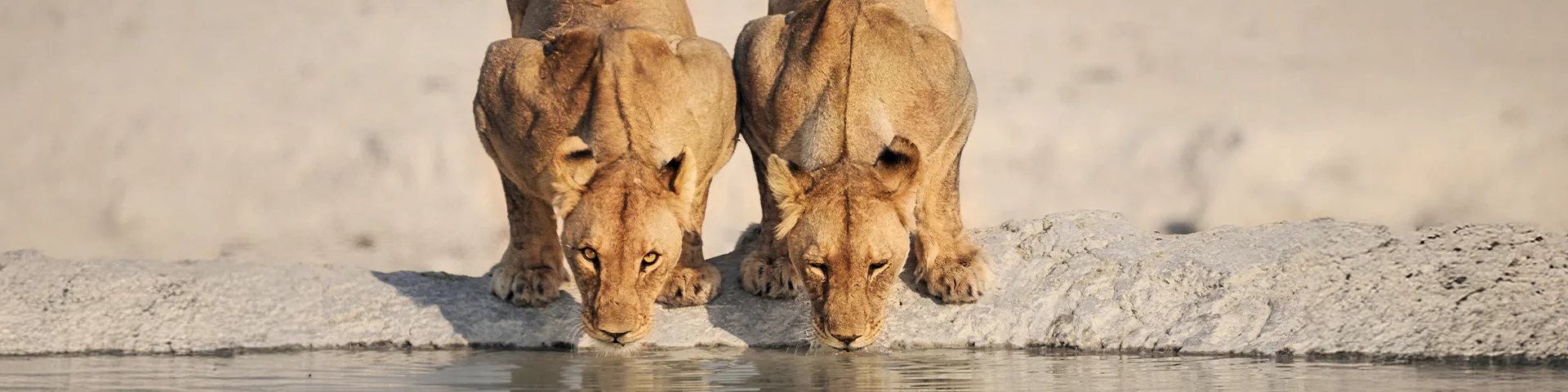 Etosha er et ørkenlandskab med store, åbne sletter, og vand er den mest knappe naturressource. Der er dog mange vandhuller her - både naturlige og menneskeskabte - og måske kan du være heldig at opleve dyrene helt tæt på, når de tørstige dyr kommer for at slukke tørsten.